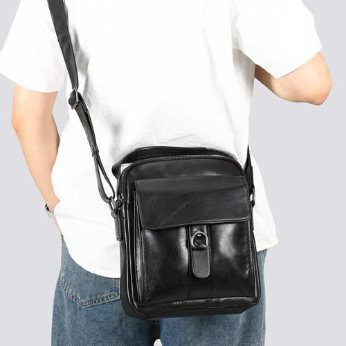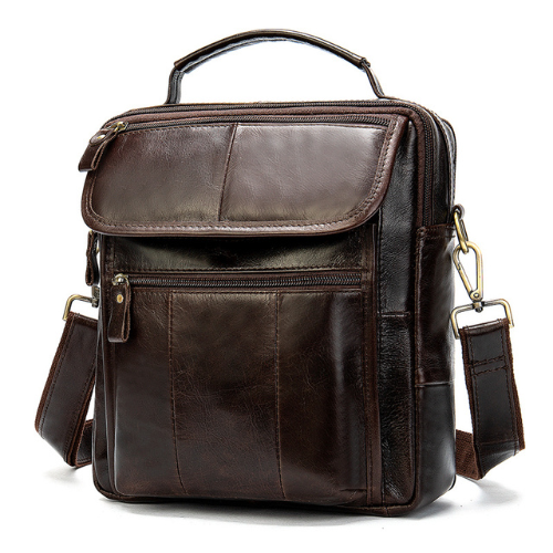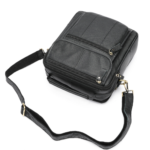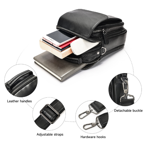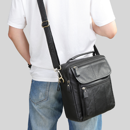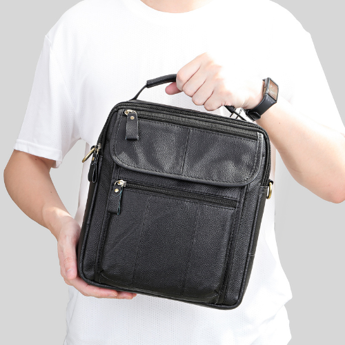 Bolso crossbody, elaborado en cuero vacuno diseñado para hombres que combina estilo clásico con funcionalidad ideal para uso diario, viajes o trabajo. Bolso tamaño mediano ideal para llevar Tablet pequeña billetera, smartphone, agenda y otros artículos personales esenciales.