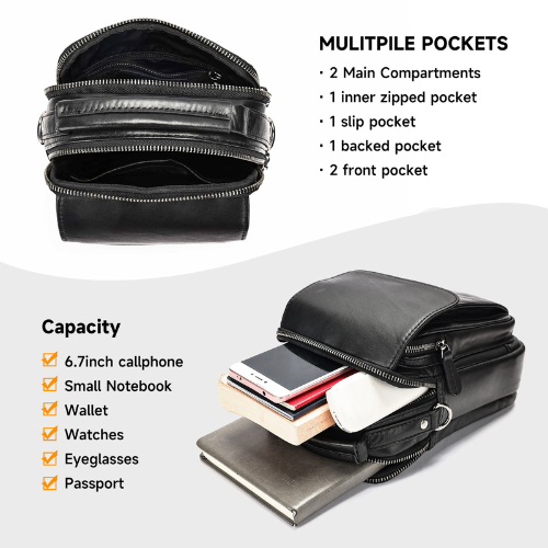 Bolso manos libres pequeño elaborado en cuero vacuno, diseñada con estilo clásico, funcional y compacto. Es ideal para el uso diario o viajes. Cuenta con compartimientos para teléfono celular y billetera.