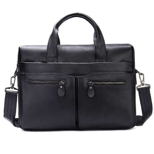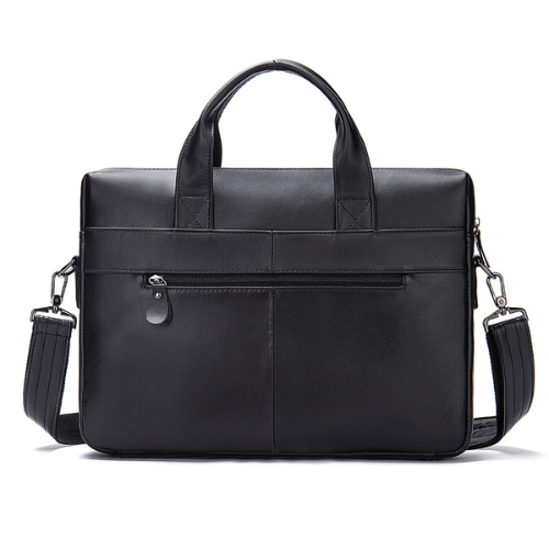 Maletín confeccionado con piel genuina color negro. Cuenta con divisiones internas para guardar documentos de trabajo, asas largas de piel ajustable y desmontable. Espacio acolchonado para laptop 14 “