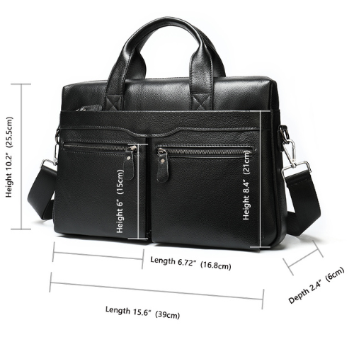 Maleta tipo maletín o portafolio ejecutivo diseñada para el entorno profesional. Confeccionada en cuero vacuno. Compartimientos frontales en la parte delantera ideales para objetos de acceso rápido como llaves, pasaporte, celular. Por su estructura rectangular y firme diseñada para llevar laptop de (13 a 15”)